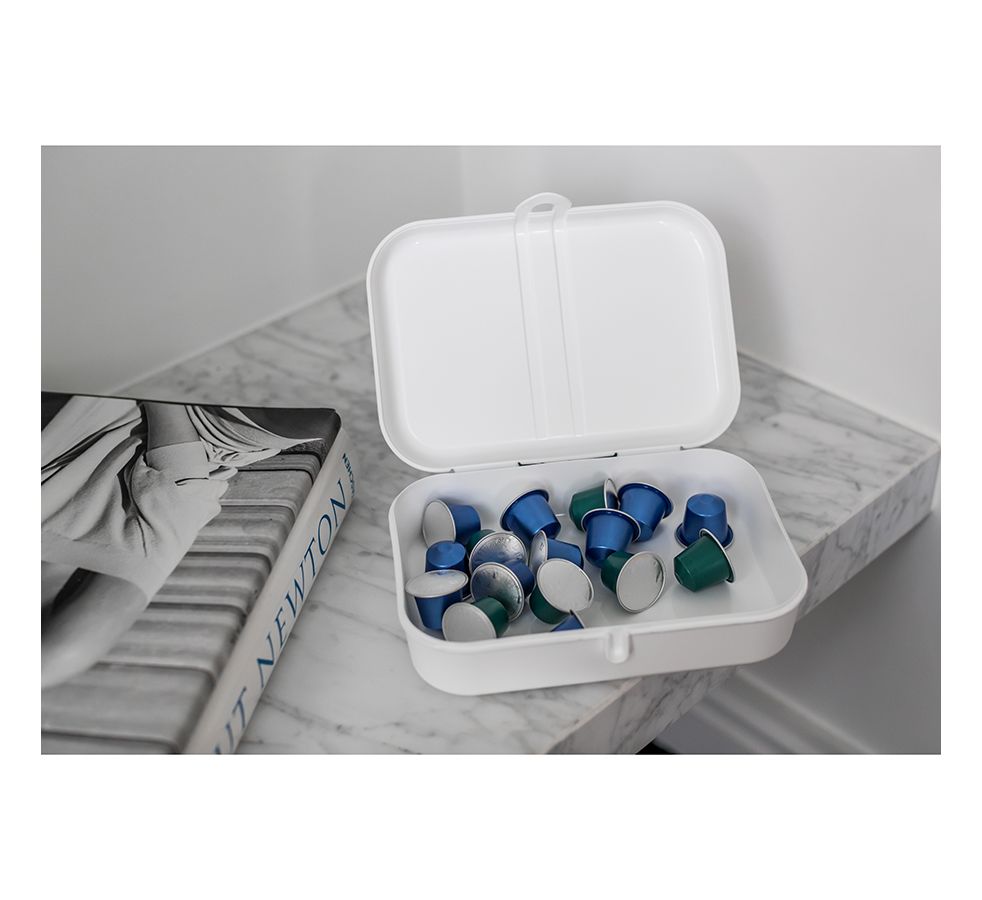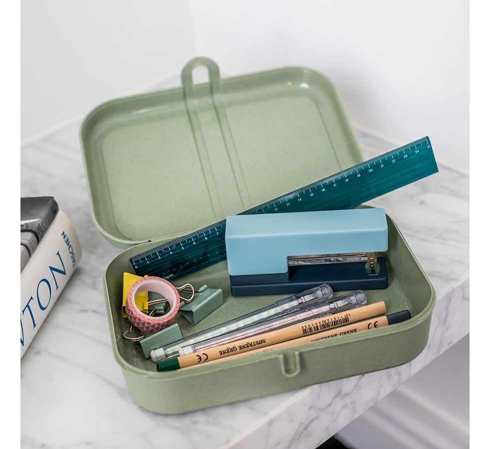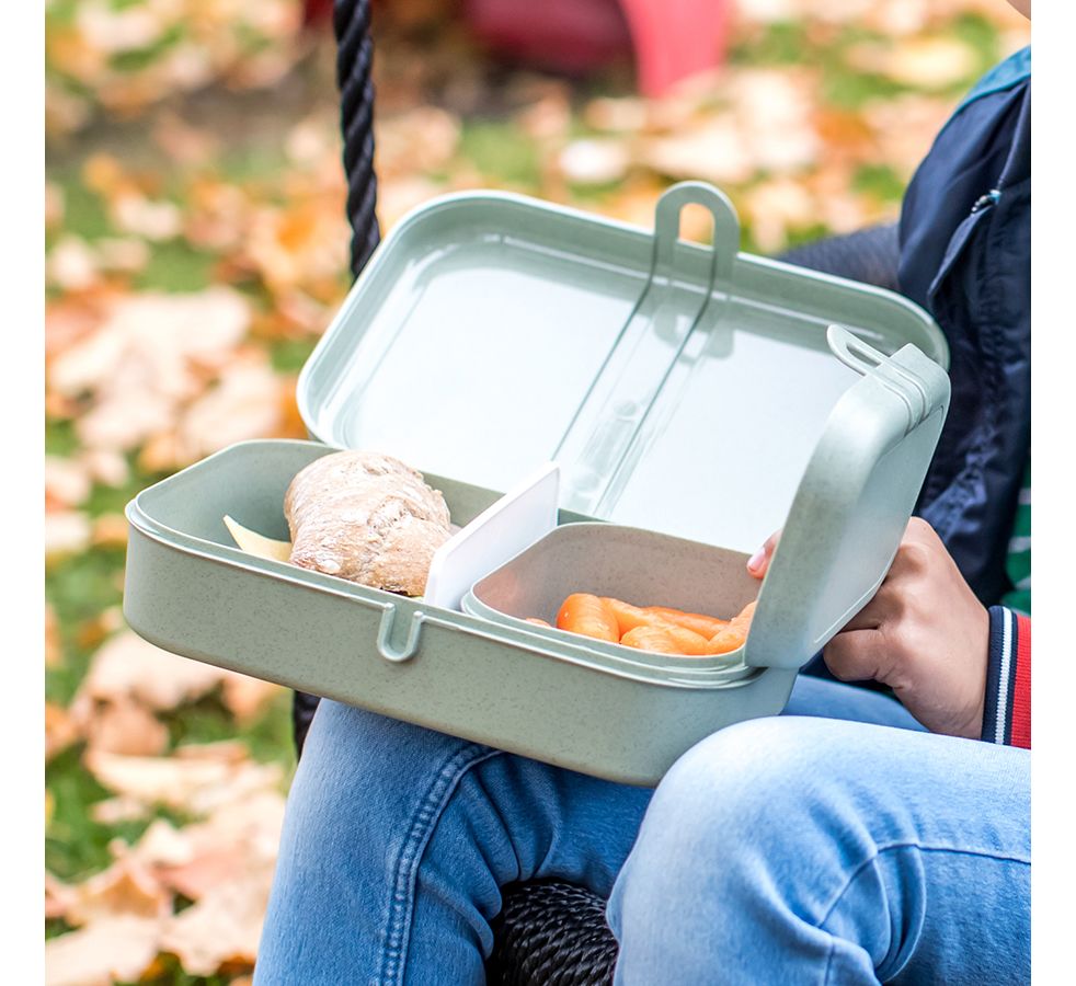 За счет обтекаемой формы и благодаря надежному зажиму емкость можно переносить в сумке или рюкзаке без риска повредить тетради, документы или другие важные предметы. Бокс вмещает бутерброды, орехи, печенье, фрукты и другие закуски. Изготовлен из органического материала на основе целлюлозы, не содержит формальдегиды, бисфенол-А.