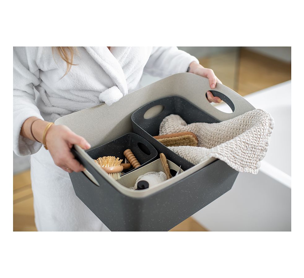 Вместительный органайзер с удобными ручками подходит для переноски одежды, полотенец, постельного белья, хранения игрушек и прочих аксессуаров. Он также может служить корзиной для белья или вовсе конейнером для отходов.