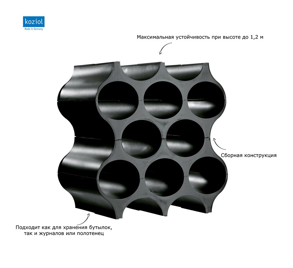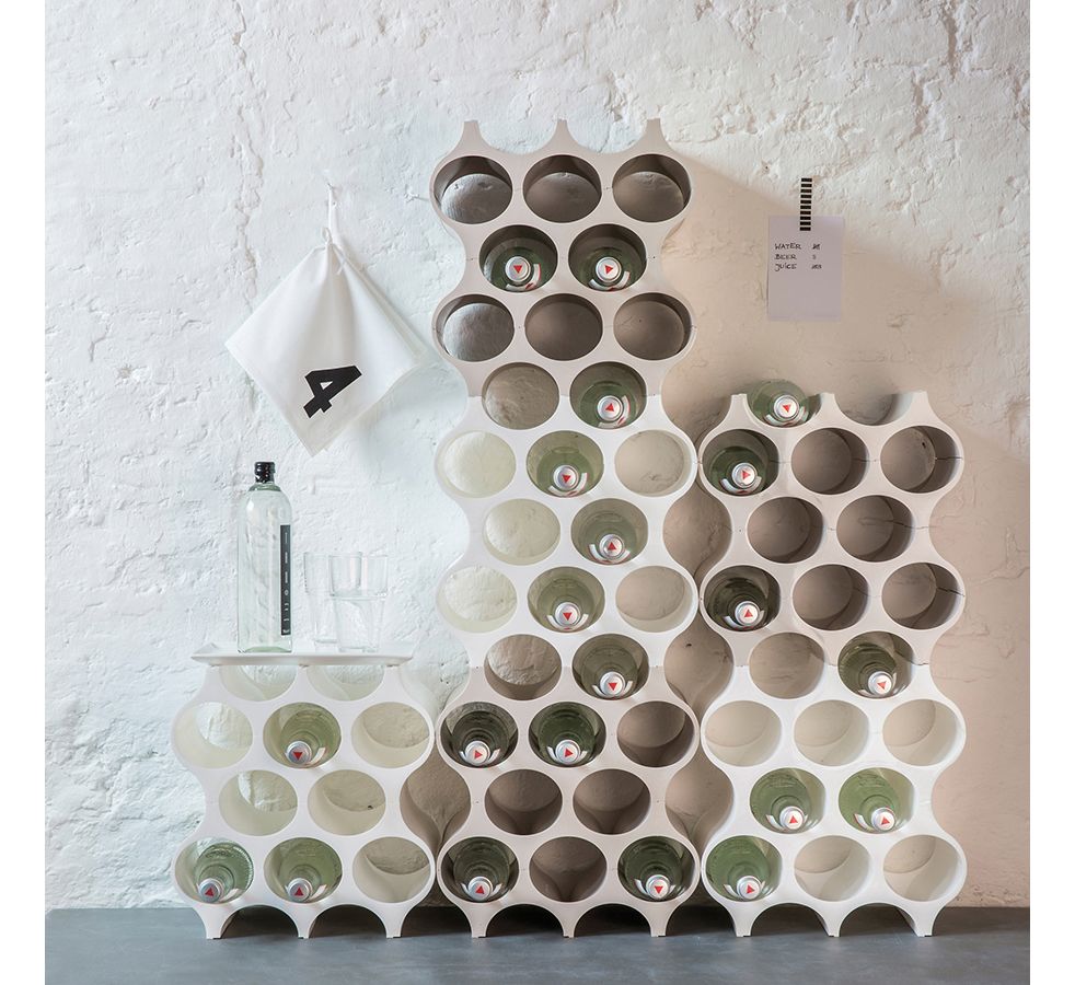 Подставка для бутылок Set-Up имеет разборную конструкцию - из нескольких наборов можно построить целую стену, и она будет служить стильным разделителем пространства в комнате. Устойчивый каркас напоминает пчелиные соты, в которых все бутылки будут в безопасности. Кроме того, внутри можно хранить свернутые журналы и газеты.
